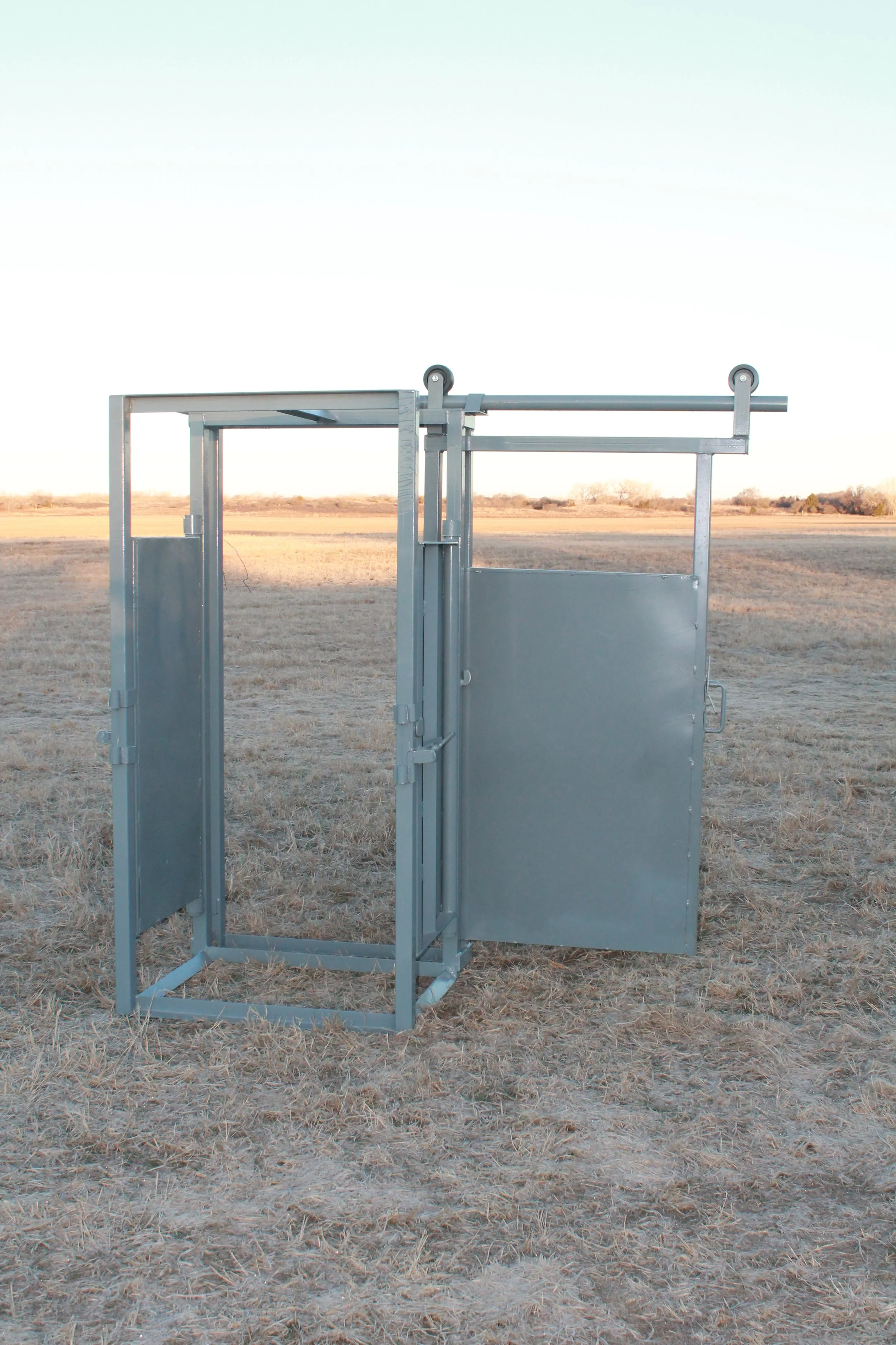 This palpation cage is a 2’ extension to the chute, allowing for a safer work zone for the operator. It is designed with 4’ sheeted doors on both sides which makes it convenient for pregnancy testing, castrating, artificial insemination, and also provides less stress for the animal. The door on this palpation cage can slide to the right or left shutting it off from the working Alley.